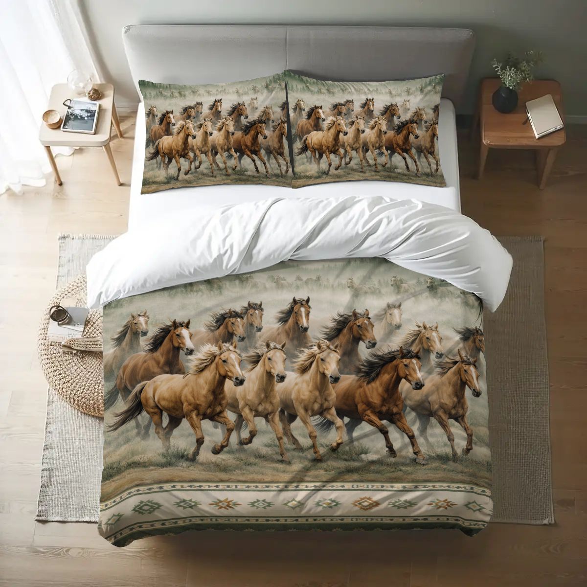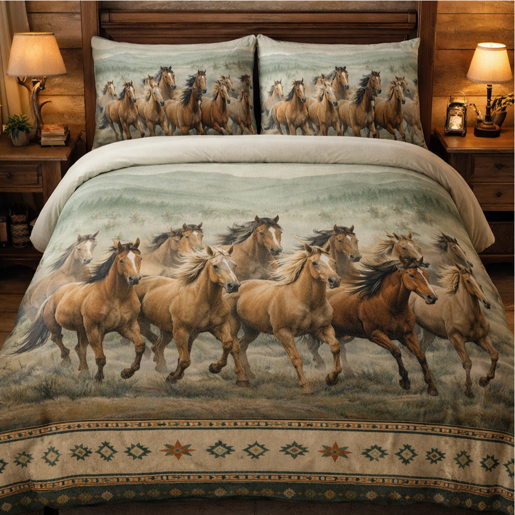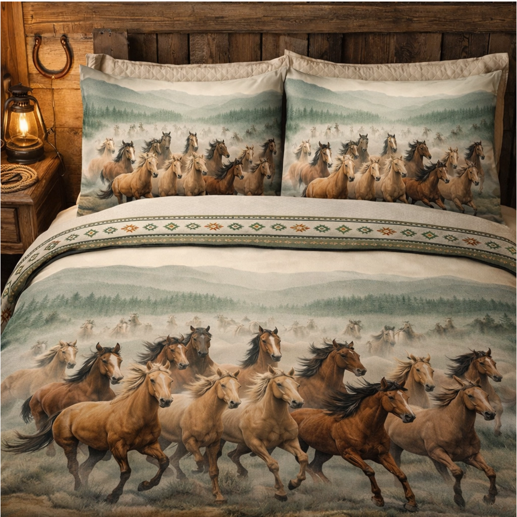 Bring the spirit of the wild west into your bedroom with our Running Wild Horses Bedding Set. Featuring a stunning, multi-layered design of galloping horses against a misty sage green mountain backdrop and authentic southwestern tribal borders. Crafted for those who love rustic elegance and equine beauty.