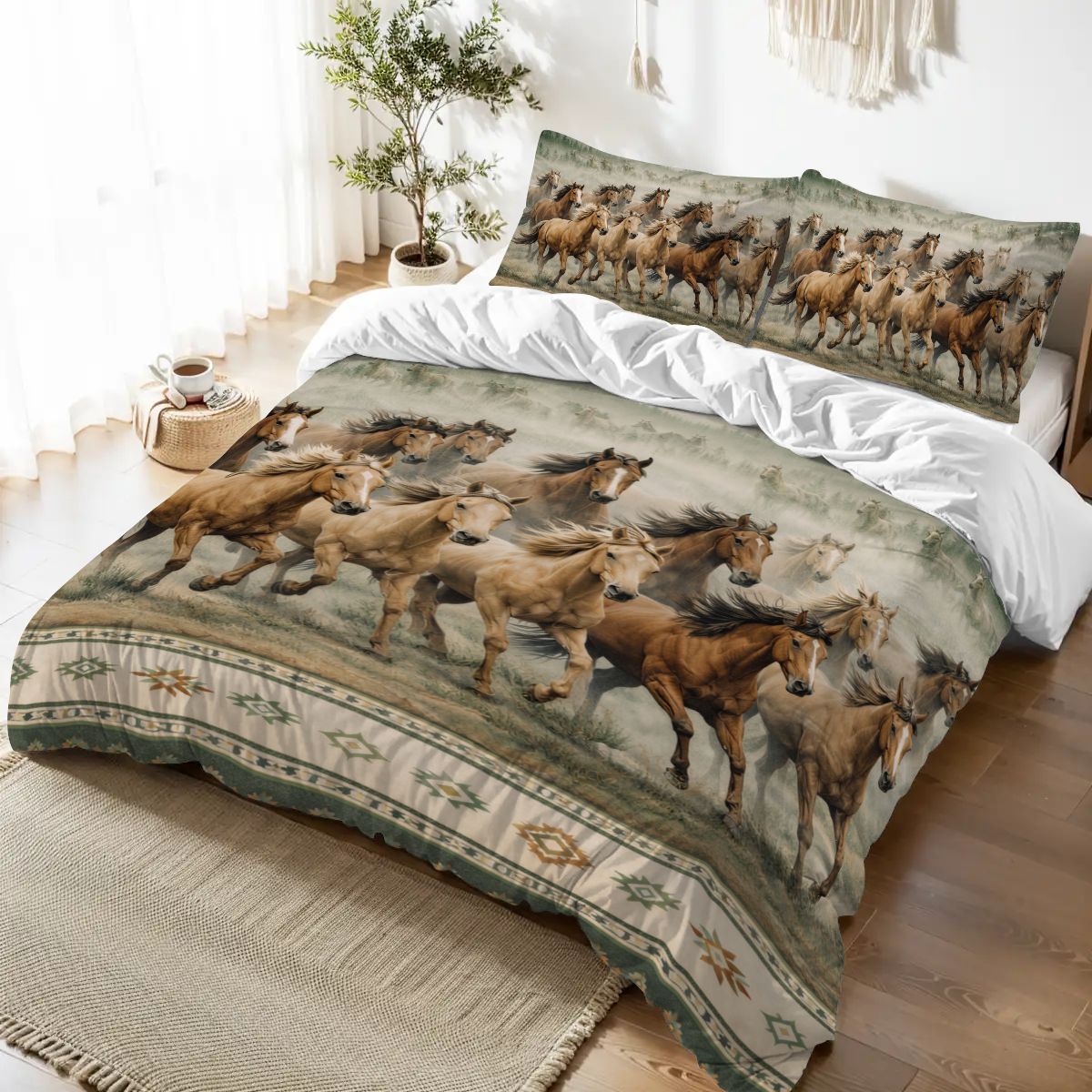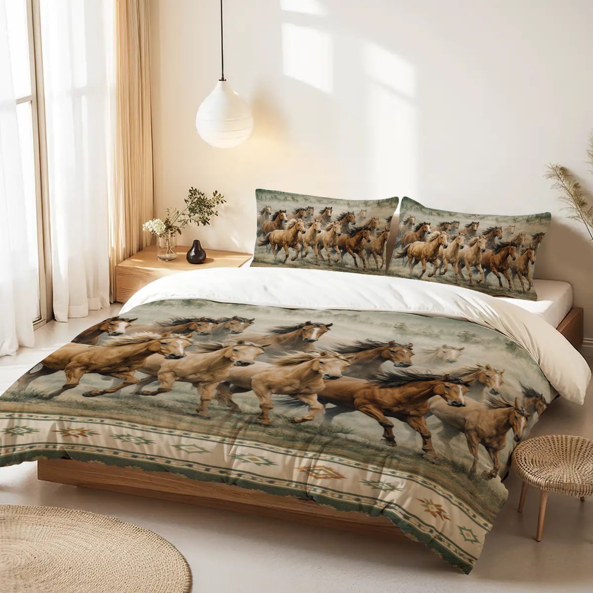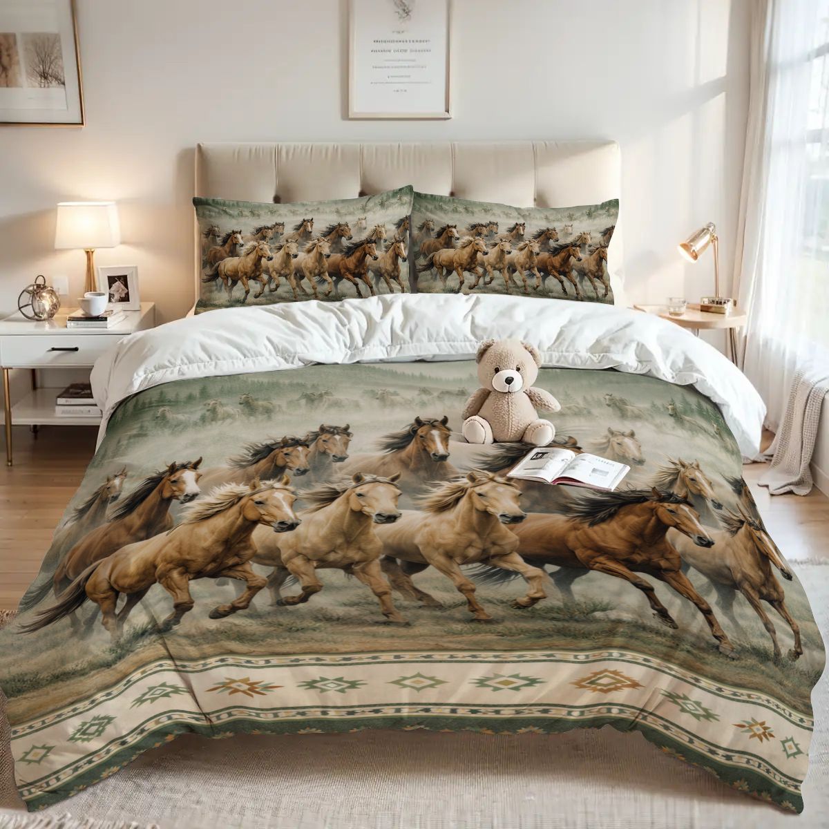 Bring the spirit of the wild west into your bedroom with our Running Wild Horses Bedding Set. Featuring a stunning, multi-layered design of galloping horses against a misty sage green mountain backdrop and authentic southwestern tribal borders. Crafted for those who love rustic elegance and equine beauty.