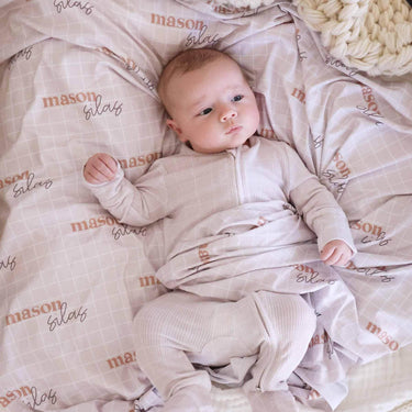 Wrap your little one in a cloud of comfort with the Sloane's Squares Personalized Swaddle Blanket! With with neutral tan squares, this swaddle is perfect for adding a touch of cuteness to your baby’s daily snuggles. Made from luxuriously soft fabric with an oversized design, this swaddle blanket effortlessly achieves the perfect swaddle to keep your baby cozy, secure, and oh-so-comfortable. Add your newborn's name to this personalized swaddle blanket to make it a one-of-a-kind keepsake that will add the sweetest touch to your little one's look, whether they’re peacefully asleep or posing for their first photos.