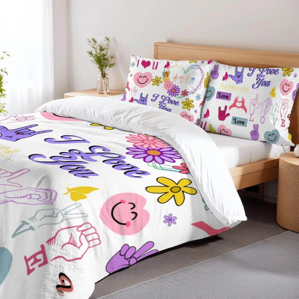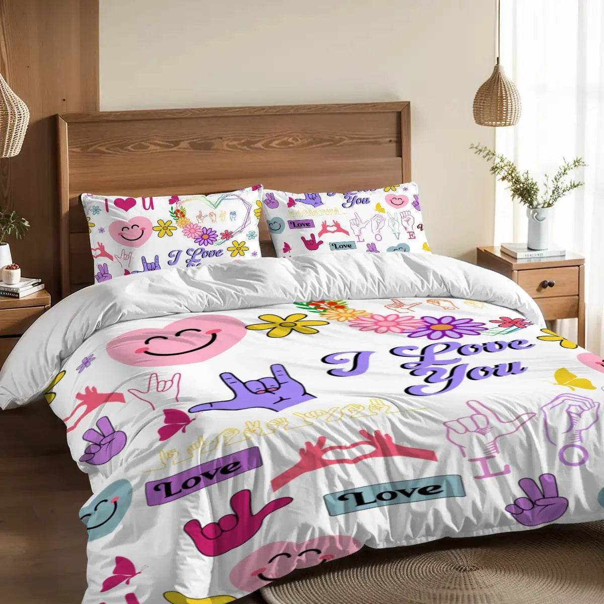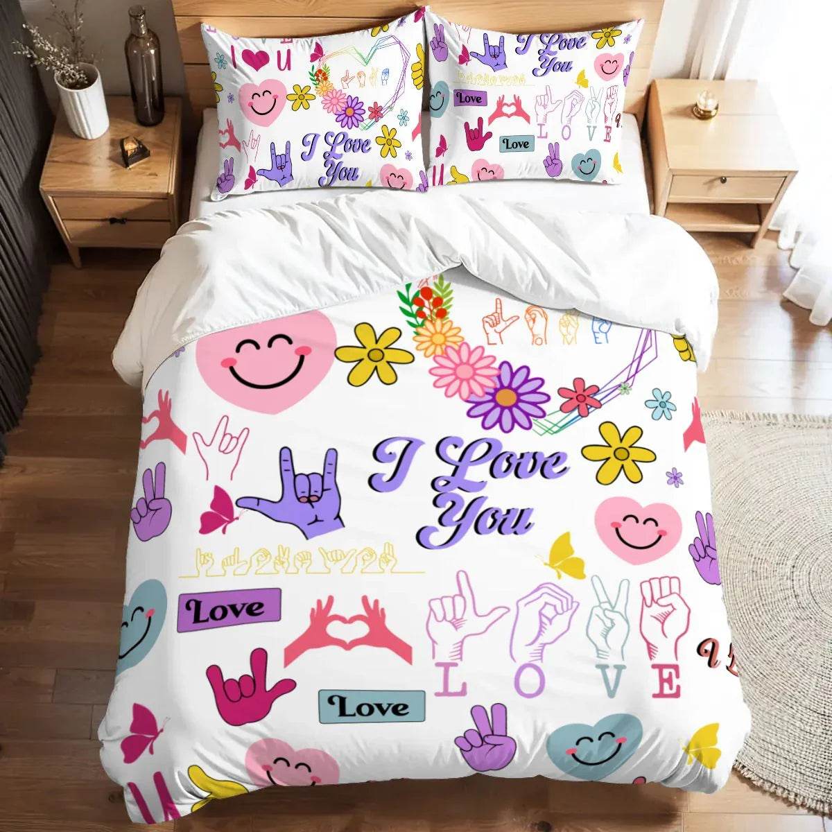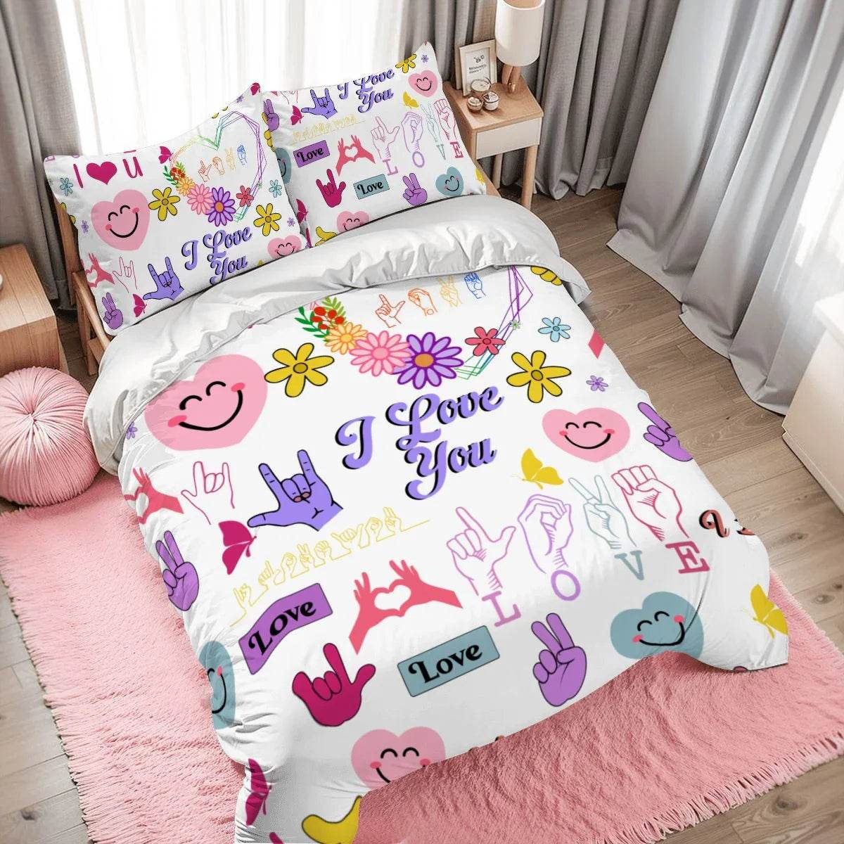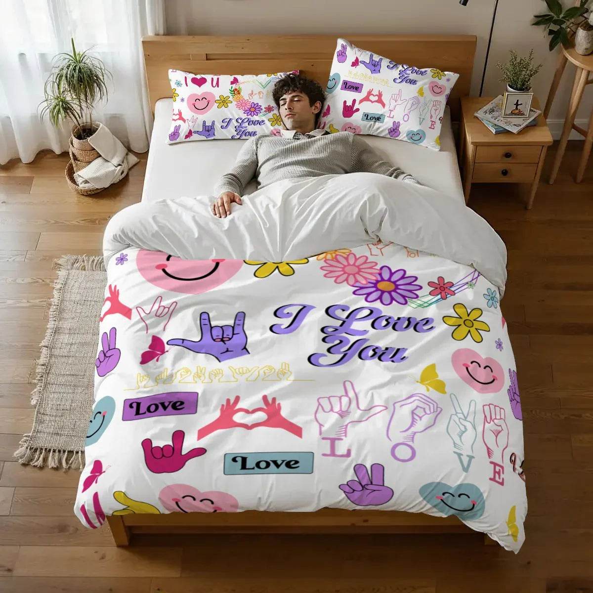 Bring a burst of color and love to your space with this personalized ASL "I Love You" duvet cover set. Crafted from high-quality polyester fabric, it offers durability, breathability, and year-round comfort. The ultra-soft texture ensures a cozy sleeping experience, while the hidden zipper closure provides a sleek, polished look and easy use. Printed using eco-friendly dyes, the vibrant artwork resists fading even after multiple washes.