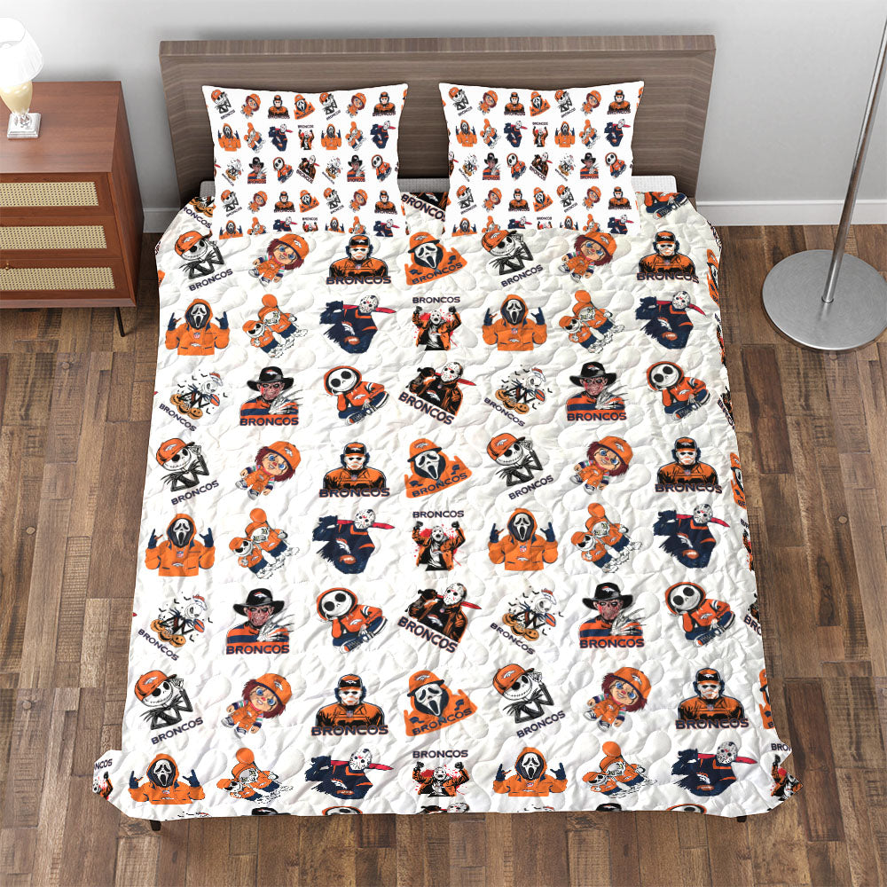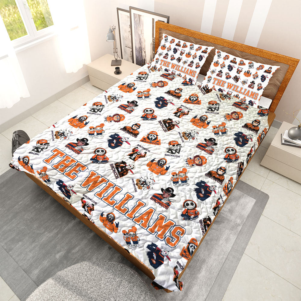 The Denver football quilt is a personalized 3-piece quilt bedding set designed to bring cozy comfort and vibrant style to any bedroom. Perfect for fans of the Broncos, this football themed bedding combines a lightweight quilt blanket with breathable cotton quilt materials to ensure year-round comfort and durability. Featuring a Halloween football bedding design, it adds seasonal charm while serving as a custom name quilt set that makes an ideal sports bedding gift.