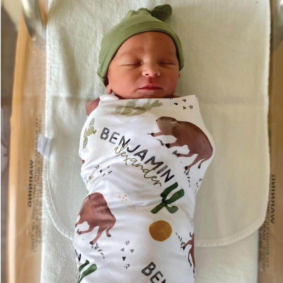 Baby bison cuddle up next to their momma, and you'll be doing a lot of cuddling too in our brand new bison and cactus print swaddle! We love these butter-soft baby name swaddles! Add some flair to your hospital gear when you wrap your newborn with their own personalized swaddle blanket. No one will forget their name! You'll love how versatile this blanket is! Use it to swaddle your newborn, for tummy time and for a security blanket once baby has reached the big kid phase. They also make that perfect gift, if you know they're set on a specific name!
