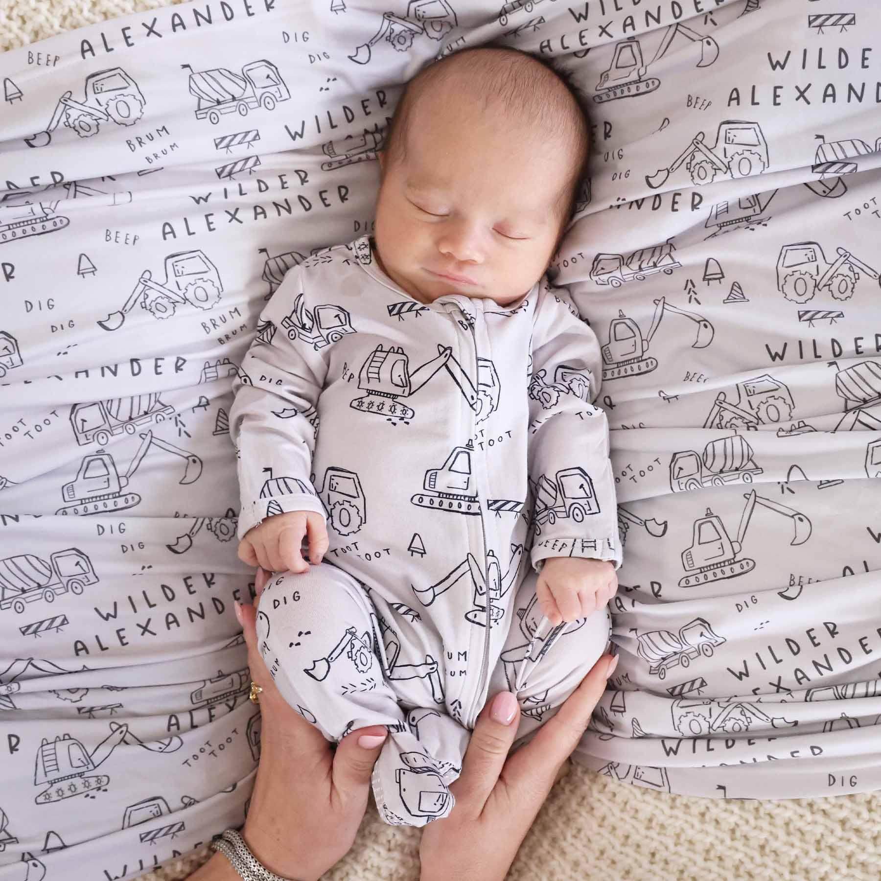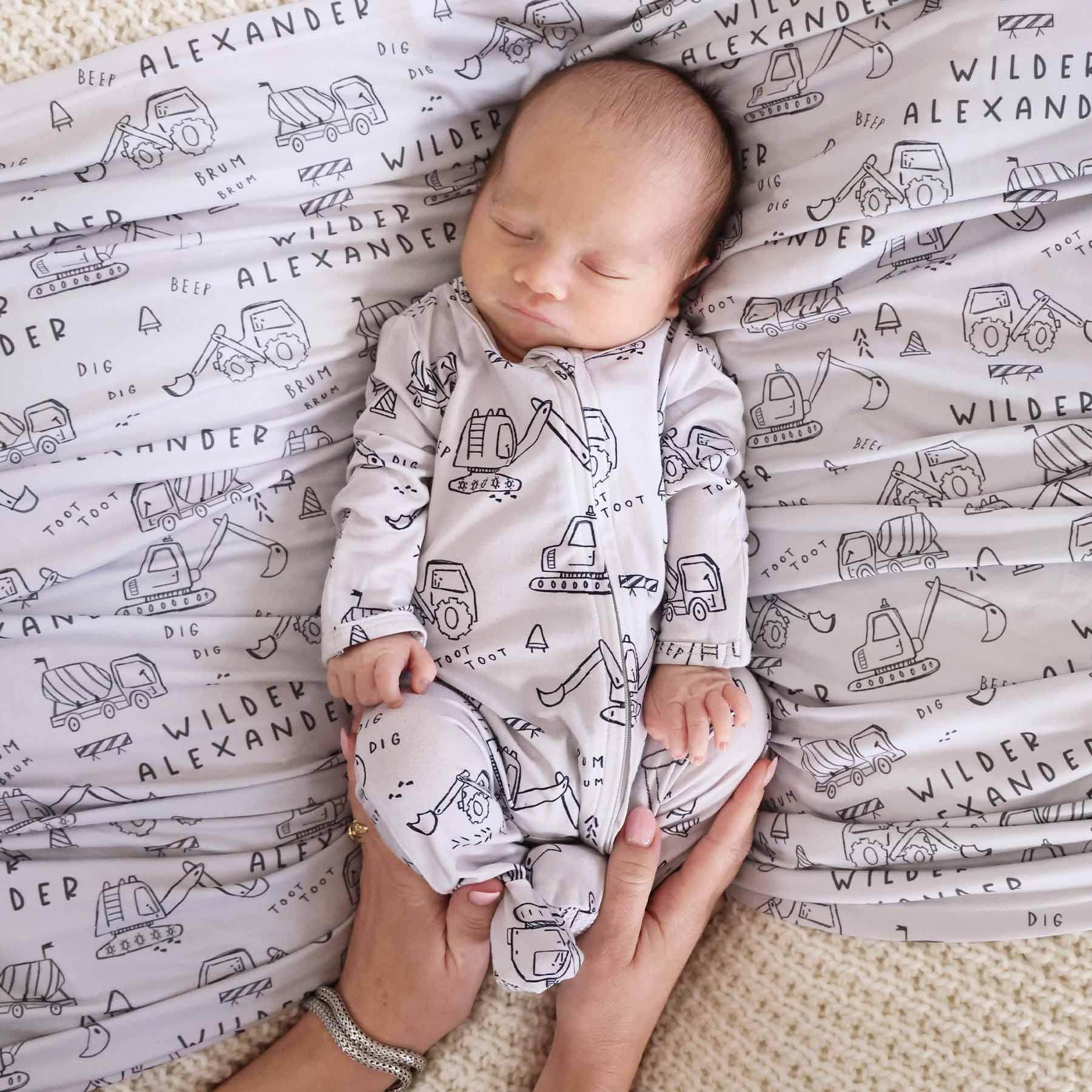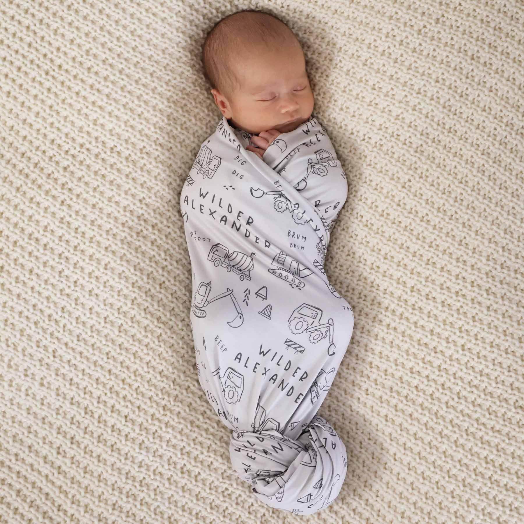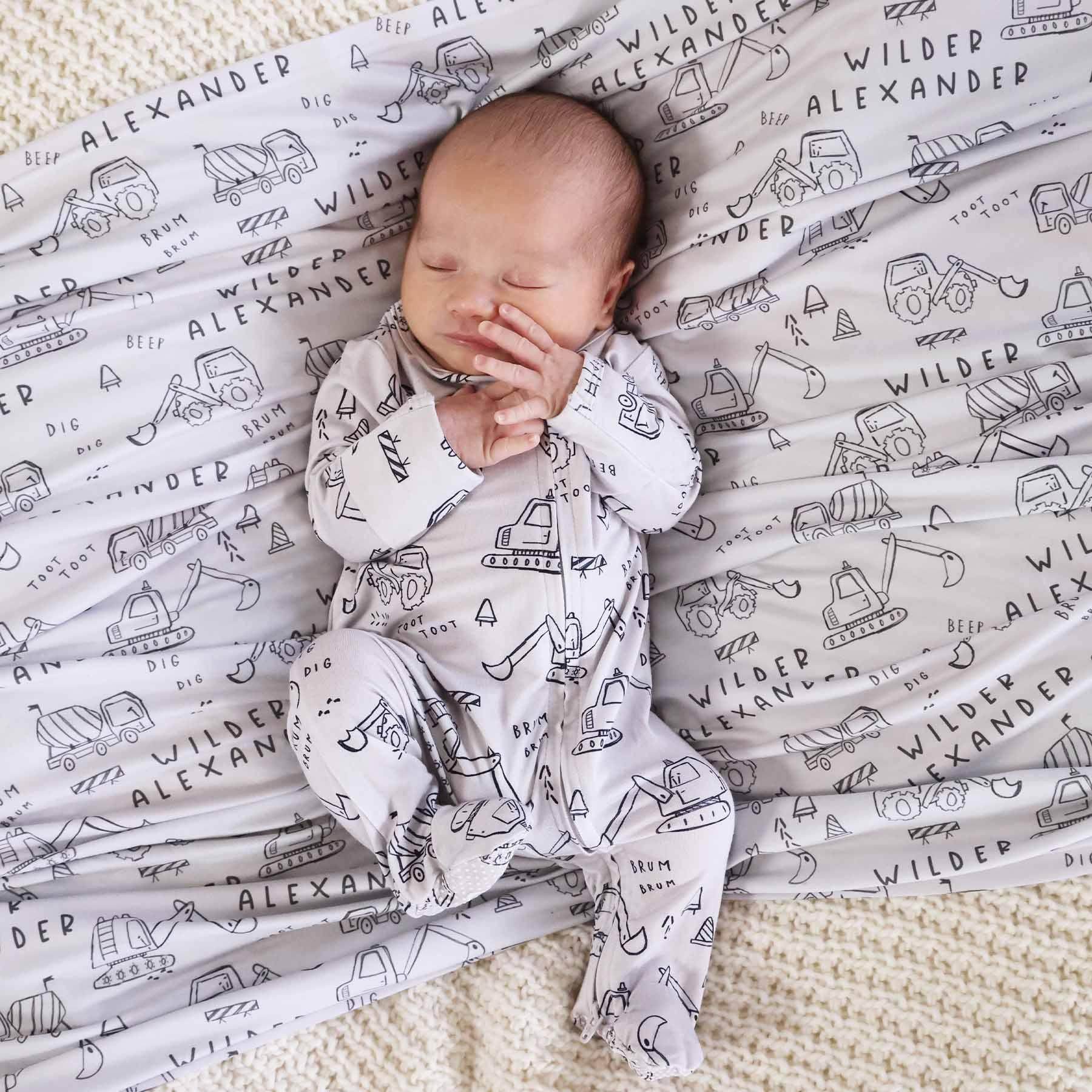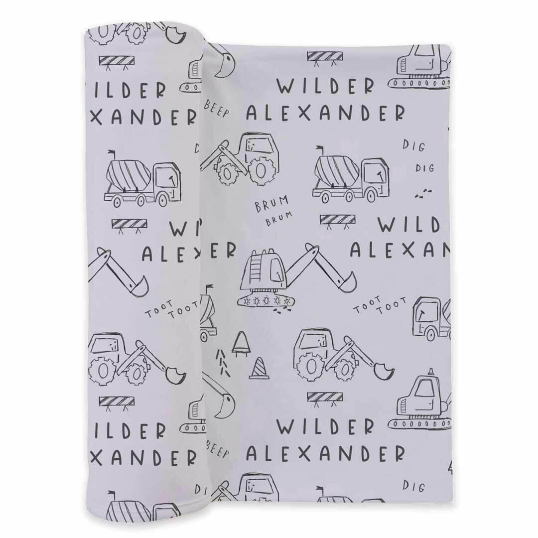 Swaddle your tiny construction worker in the softest, most adorable personalized blanket! Designed for newborn snuggles and beyond, this swaddle features the hand-drawn Doodle Dozers print, filled with playful construction trucks and equipment. Made from buttery-soft fabric, this blanket is perfect for swaddling, tummy time, or as a lightweight security blanket as your baby grows. The personalized touch makes it a memorable keepsake if you're looking for the perfect baby gift!