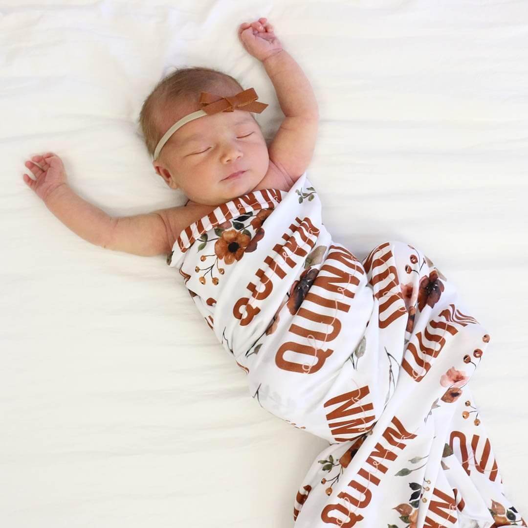 Such an on trend rustic vibe in our personalized rust floral swaddle. We love these butter-soft baby name swaddles! Add some flair to your hospital gear when you wrap your newborn with their own personalized swaddle blanket. No one will forget their name! You'll love how versatile this blanket is! Use it to swaddle your newborn, for tummy time and for a security blanket once baby has reached the big kid phase. They also make that perfect gift, if you know they're set on a specific name!